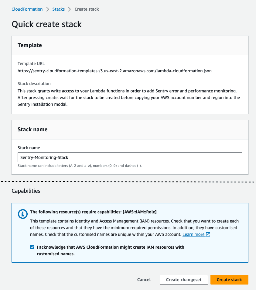 5. Scroll to the bottom of the Create Stack page, check the box, then press Create Stack to create a CloudFormation stack in your current region. This stack allows Sentry to automatically instrument your Lambda functions.
